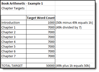 With your total wordcount target in mind, create a spreadsheet that lists your chapters and their respective word count targets. If you’ve got seven chapters in your 50k-word book, that’s roughly 7k words per chapter (49k divided by 7), plus an extra thousand for an introduction. (See how that adds up?)