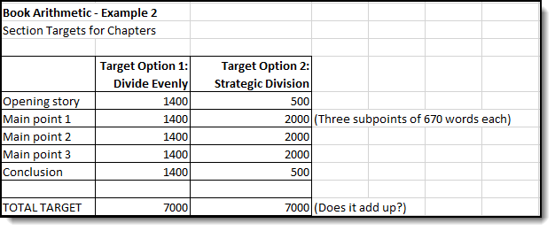 While working on your draft, you can break down your goals even further within each chapter. If you know each chapter has an opening story, three main points, and a concluding section, you can break the chapter into five equal sections of 1400 words.
