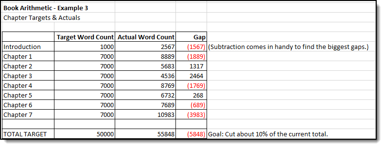 As you revise, keep a running tally so you know where you are and how much more you need to tighten to reach your target. On a related note, look especially at the largest gaps to determine if the chapters are out of balance—our final arithmetic tip.
